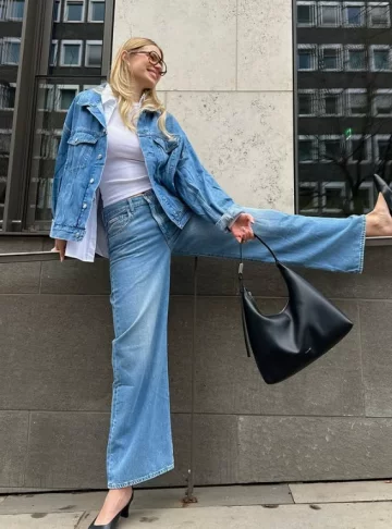 Базовая футболка – еще один беспроигрышный вариант. Белая, черная или полосатая, она создает простой и стильный образ для выходных или скорых встреч. Для вечера выберите темный деним, добавьте топ с вырезом, корсет или блестки, а также клатч и каблуки. В холодный сезон широкие джинсы прекрасно сочетаются с пальто до колена – это классика, которая делает образ цельным и сдержанным.